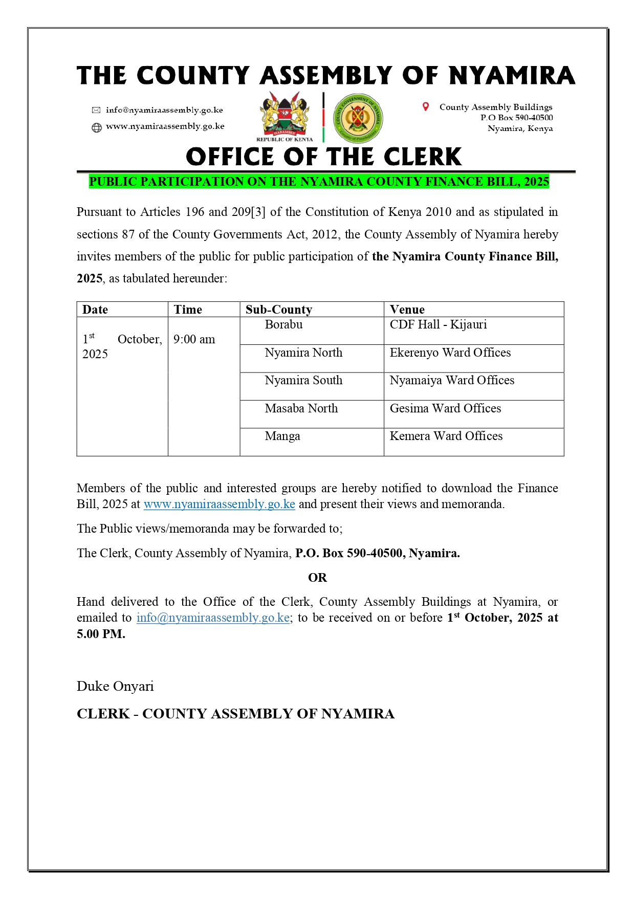 Our Assembly allows you to participate and engage in the county assembly business by raising your voice in the development and contribution of various legislature that will directly or indirectly improve the livelyhood of Nyamira County residents.